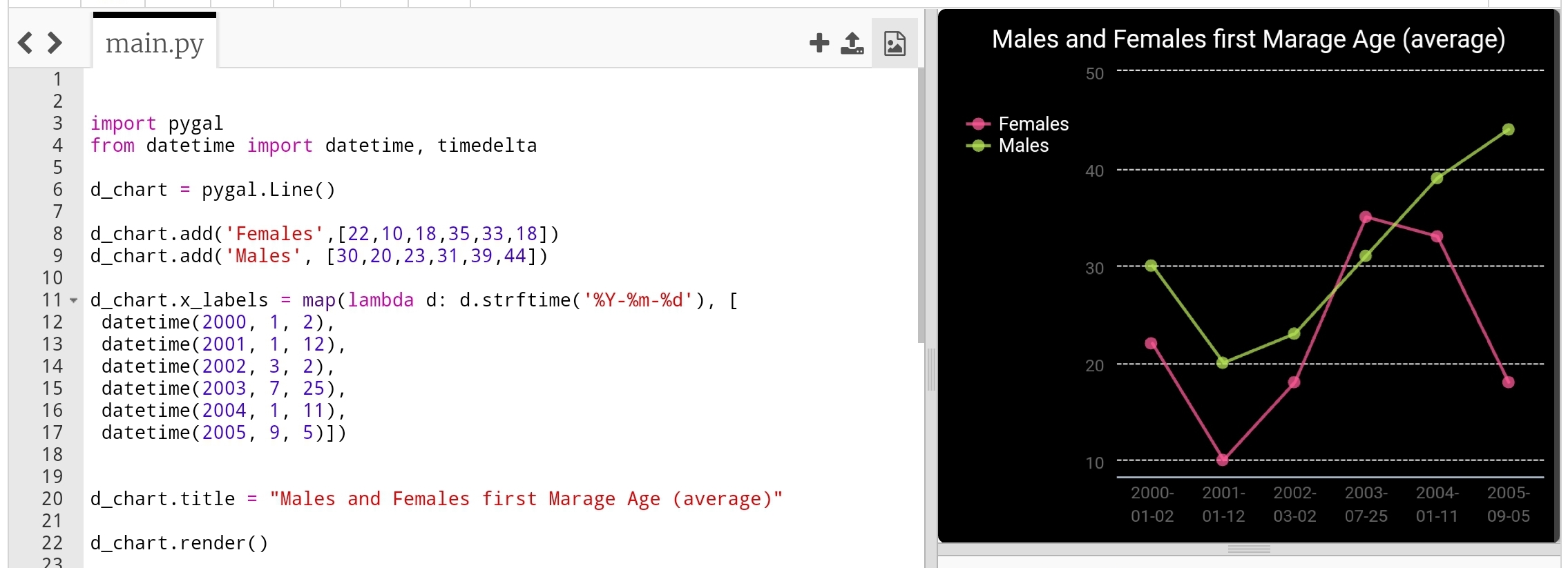 In this post we will talk about Line-chart using pygal library in python, Line-chart has three sub-type as: Basic, Stacked ,Time. We will use the data-set for Average age of Males and Females at first Marage during 6 yeaars (2000 and 2006), the code line to set the data data will be as :