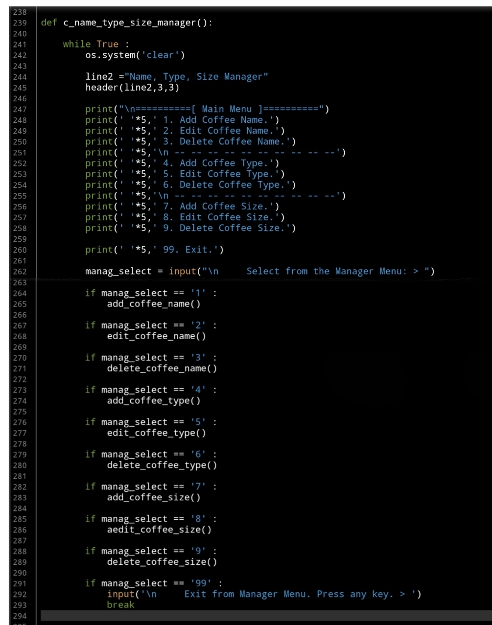 So, let’s start with writing the Manager Menu Function and a while loop to take the user selection and trigger the corresponding Function… Here is the Code ..