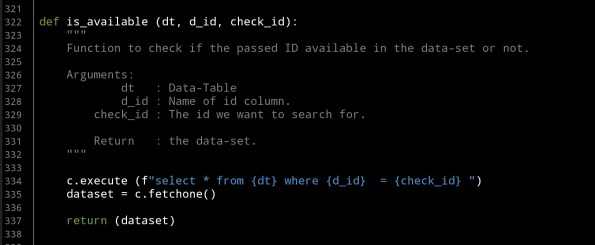 The second Function will be used to check if the user selection is available in the database, we will call it def is_available (dt, d_id, check_id) this Function is to check if the passed ID available in the data-set or not. The Function will take three Arguments as: