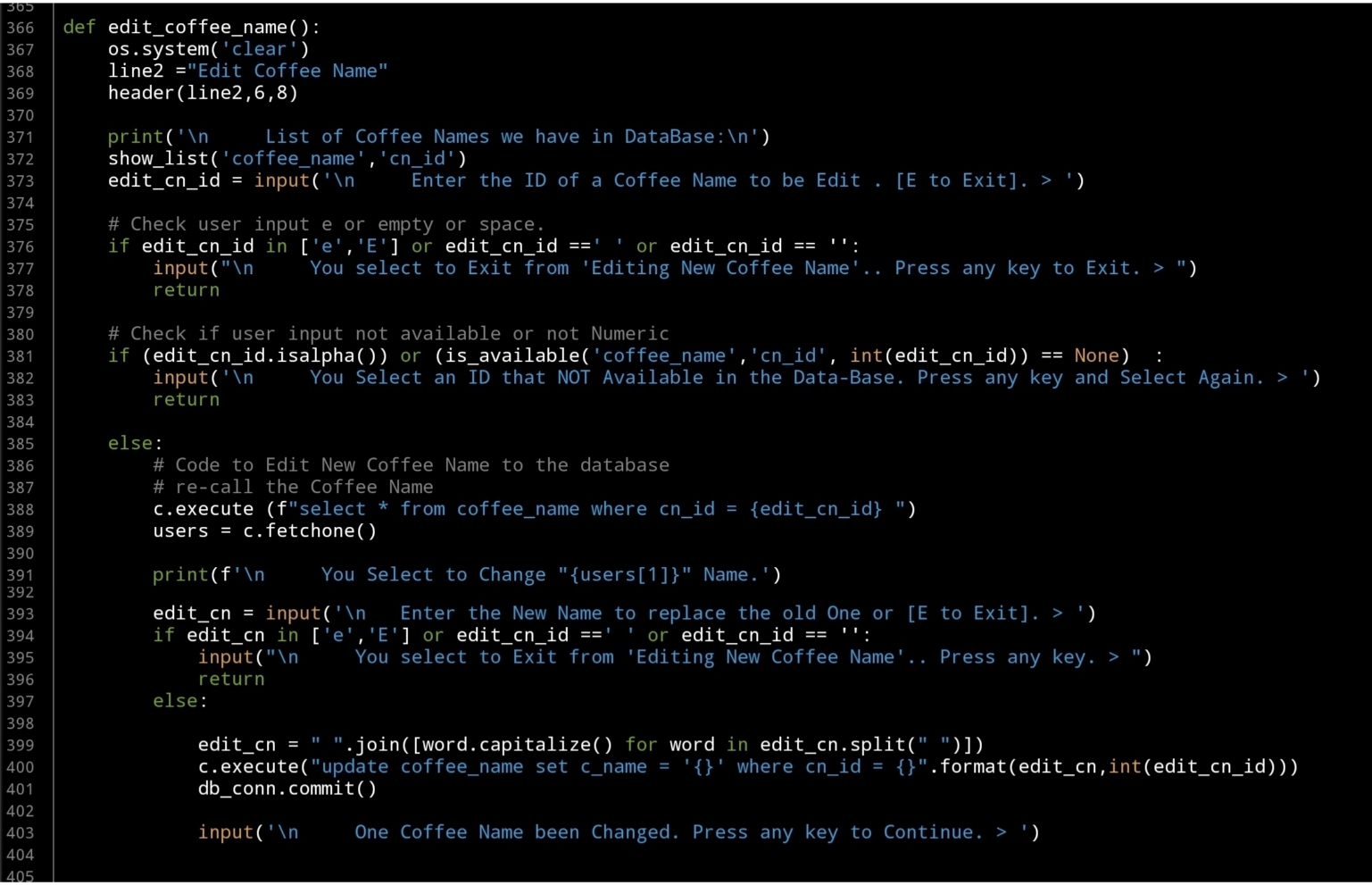 Next we will write the Edit Function, and again after the header and show_list(‘coffee_name’,’cn_id’) we will ask the user to enter the ID of the Coffee Name to be change, here we will do a simple validation on user input. After that we will update the record that the user select. Here is the code..