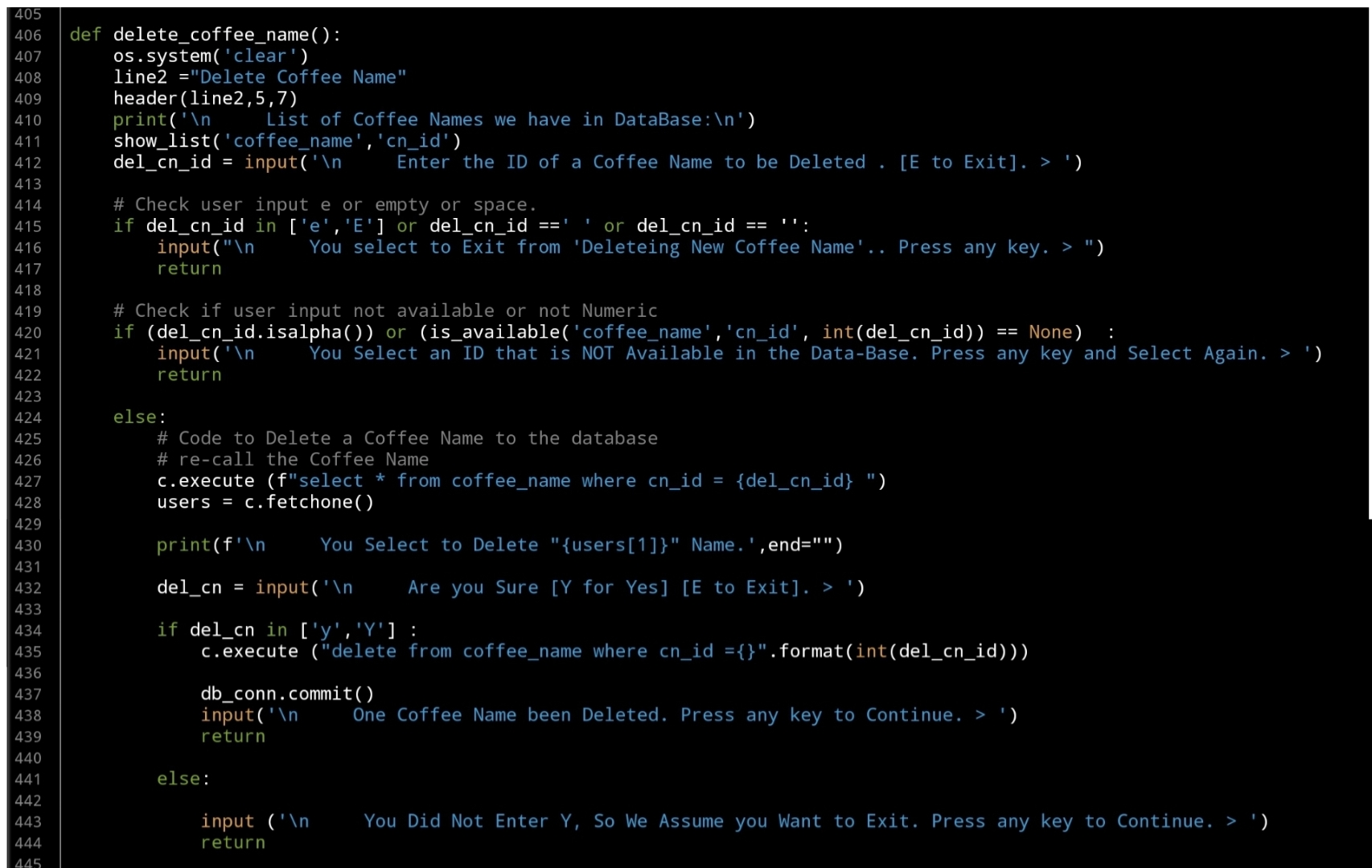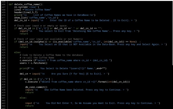 Last Function in this part is to Delete a selected Coffee Name by selection it’s ID, as in the Edit Fnction, the user will select an Id, we will check the availability the will execute the Delete command. Here is the code..