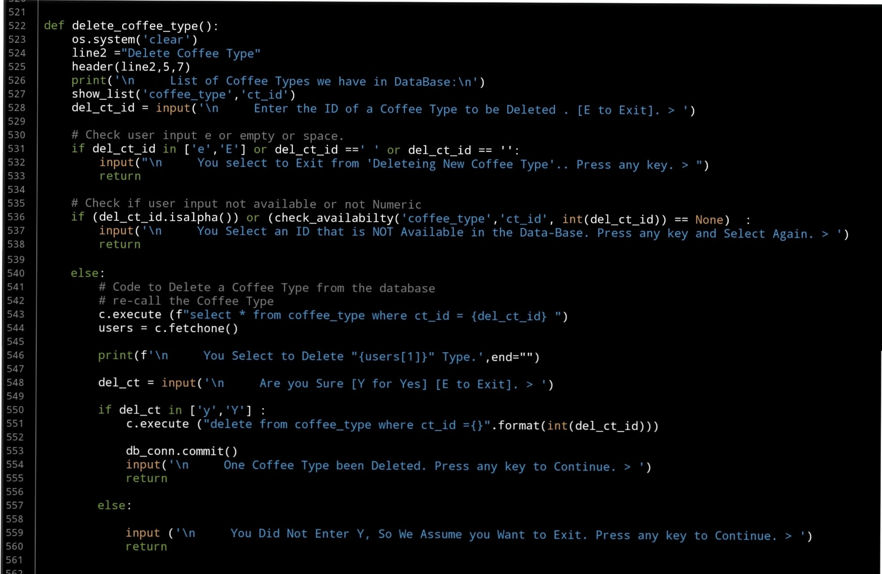Last Function in this part will be to Delete a selected Coffee Type, so again we will list all Coffee Types we have and will ask the user to select the one to be Deleted, then we execute the SQL command to Delete the record from the database… Here is the code..