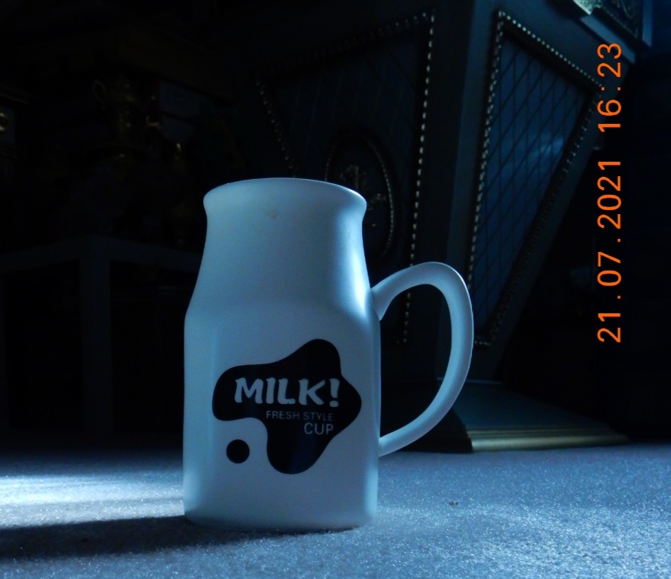 This Shot: In a one of photo sessions i take several photos of a Milk Mug, I place the Mug on the ground and let the sun light come through a window in the room, I set up the camera to take a Black & White [Read this Post], the Nikon S9900 provide controlling over the colors [color filttering]; so here is another shot allowing to the Blue color only to reflect from the object.