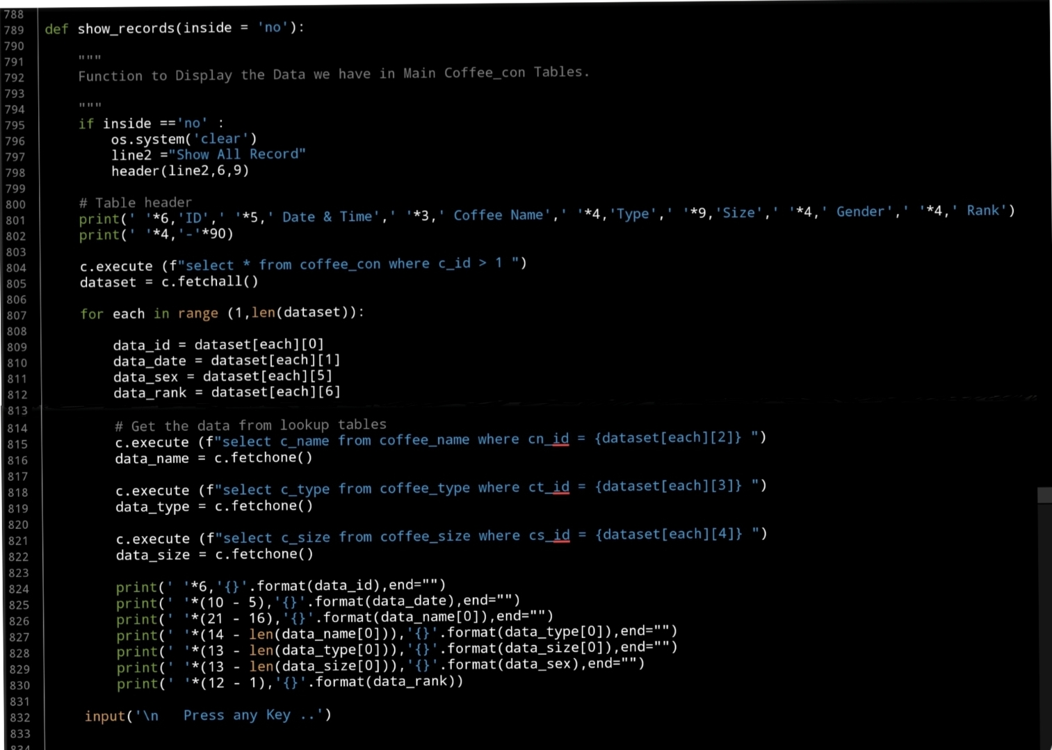 print(‘ ‘*6,’ID’,’ ‘*5,’ Date & Time’,’ ‘*3,’ Coffee Name’,’ ‘*4,’Type’,’ ‘*9,’Size’,’ ‘*4,’ Gender’,’ ‘*4,’ Rank’)