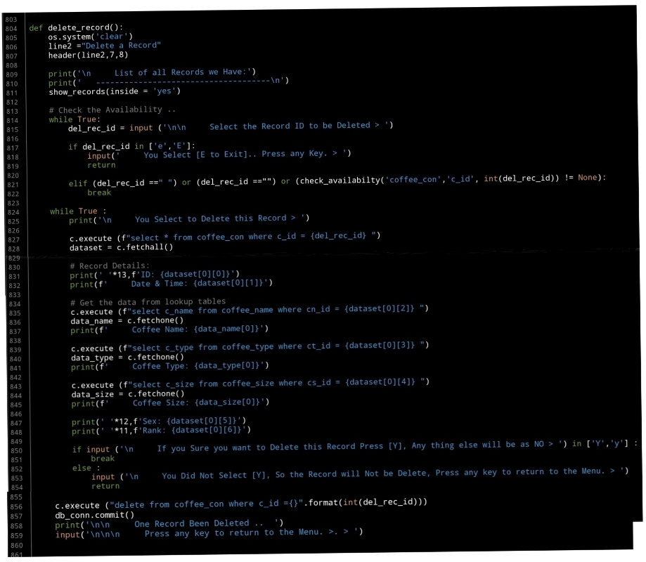 elif (del_rec_id ==” “) or (del_rec_id ==””) or (check_availabilty(‘coffee_con’,’c_id’, int(del_rec_id)) != None):