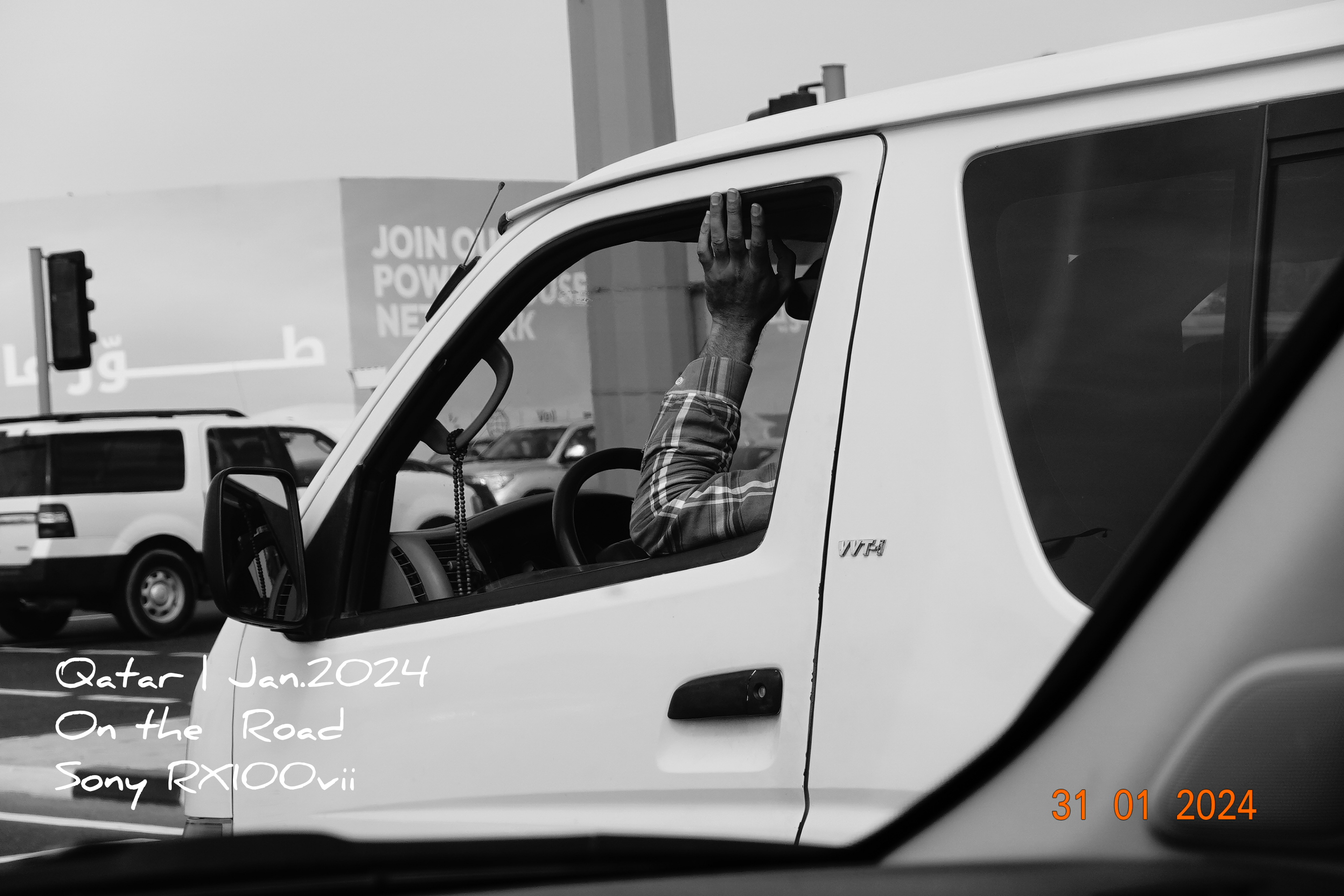 Here in this article I am posting two pictures taken by the RX100vii on the road while I was waiting on traffic lights. The image is for a next car driver putting his arm out of the window, first shot was with B/W Black and white Mode.
