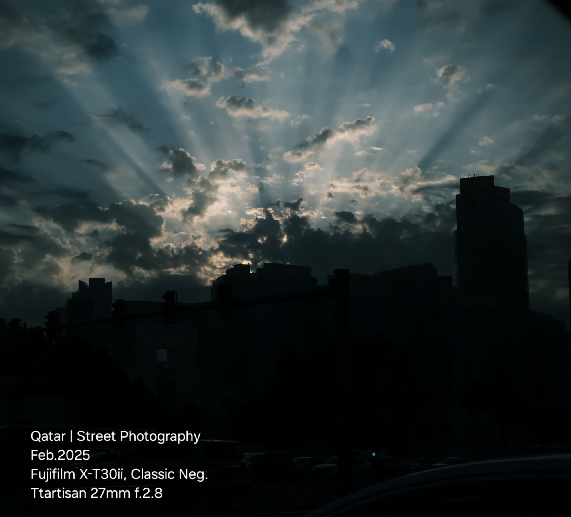 The sun trying to pass through the clouds ⛅️, and it sen it’s light beem there, I take the shot using the FujiFilm X-T30ii camera with Ttartisan 27mm f2.8 lens, in Classic Neg. film simulation.