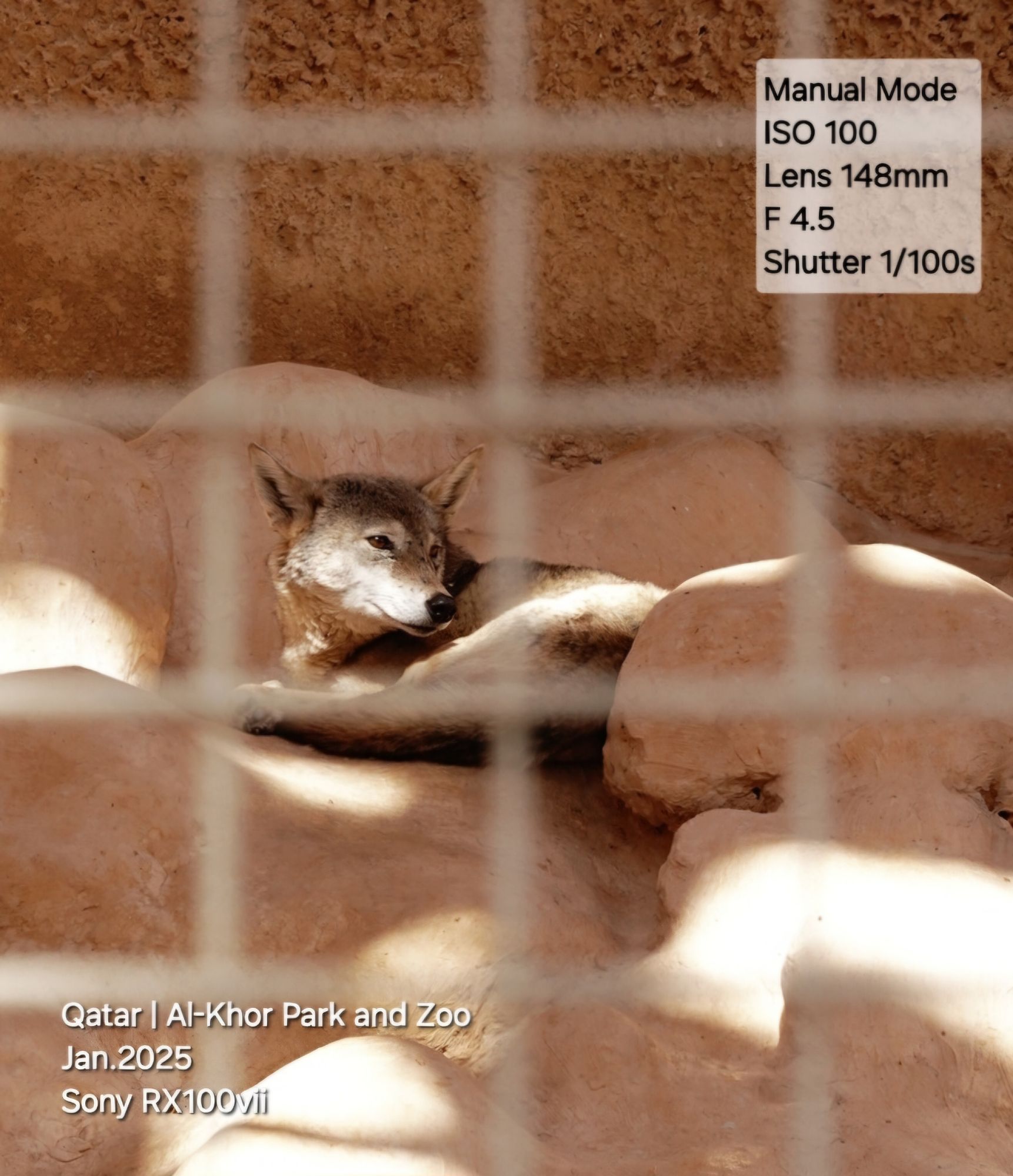 A moment ago, this wolf was starting at me, there is another one  down the rocks walking in the cage. I use the 150mm zoom in the Sony RX100vii camera to take this shot in Classic Chrome.