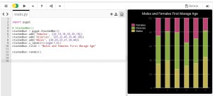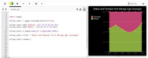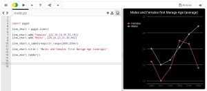 In this post we will talk about Line-chart using pygal library in python, Line-chart has three sub-type as: Basic, Stacked ,Time. We will use the data-set for Average age of Males and Females at first Marage during 6 yeaars (2000 and 2006), the code line to set the data data will be as :