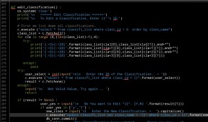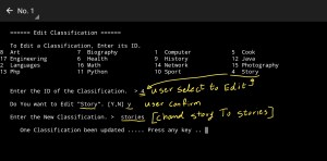 Another Function to work on is Edit a Classification information In this one we will print-out all the Classifications we have and the user will select the one to Edit and will asked to Enter the ID number next to it. Then to Enter the New One and we will save it. Here is the code and the Out-put screen shot. To display all classifications on the screen we will use this code..