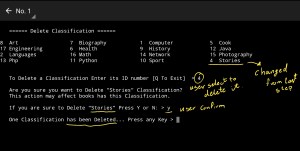 Next we will work on the Delete a Classification, Deleting may effect on some Books that uses that classification, so we need to till the user to confirm Deleting. Also we will use the same code to list down all the classifications and ask the user to enter the ID of the one to-be Deleted. Here is a part of the code to Delete a classification..