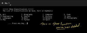 Now, let’s start with Add New Classification. Simply we will ask the user to write a classification to be added to the Database, then we will check if it is already available in our Database, If yes then we will till the user so, or (if not available) we will add it, and will give the user the chance to add another one. If the user enter (Q or q) then we exit (Quit) from the function and return to the previous Menu.