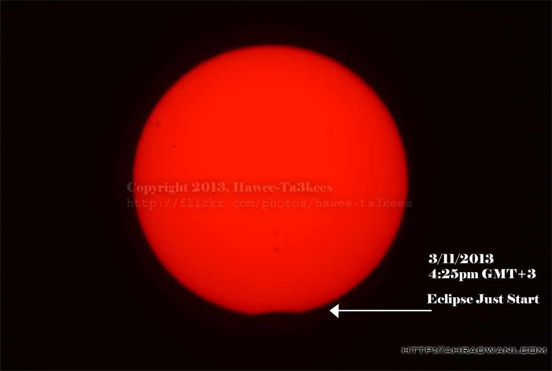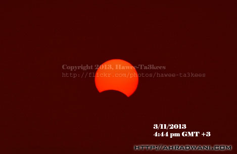 Solar Eclipse on 3/11/2013 start on 4:22pm GMT+3 and continued till the sunset, in my location the sun hides behind some buildings before actual horizon so I did not get the very last moment of the phenomena.