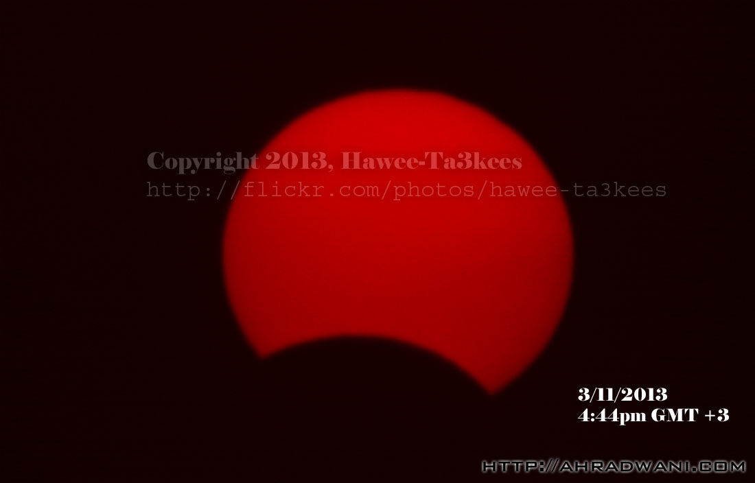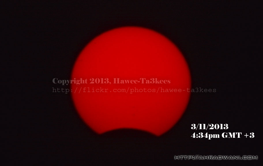 كسوف الشمس بتاريخ 3/11/2013 بدا الكسوف الساعه 4:22 عصرا واستمر حتى مغيب الشمس تم الطقات الصور باستخدام فلتر لتجنب نور الشمس وحماية العدسة