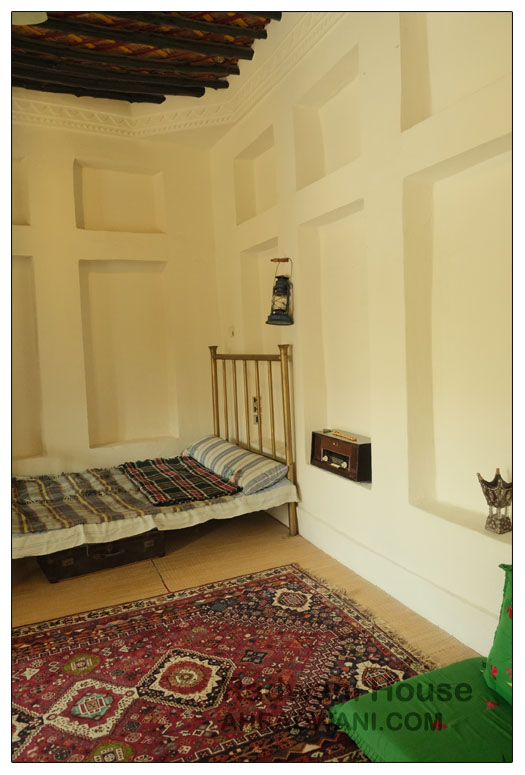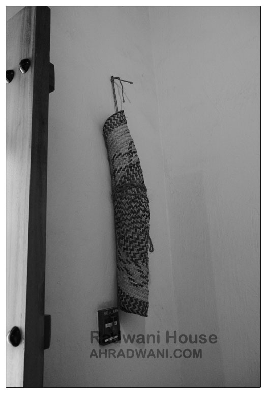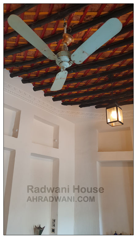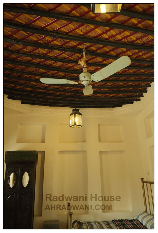 [60] About: Bed-Room 2: Ceiling was made of Palm Trunk and Palm Fronds [Palm Trunk and Palm Fronds was the main raw-materials to build ceilings in all the houses at that period of time]. We can see the Fan and electrical lights. كان السقف مصنوعًا من جذع النخيل وسعف النخيل [كان جذع النخيل وسعف النخيل المواد الخام الرئيسية لبناء الأسقف في جميع المنازل في تلك الفترة الزمنية]. يمكننا رؤية المروحة والأضواء الكهربائية.