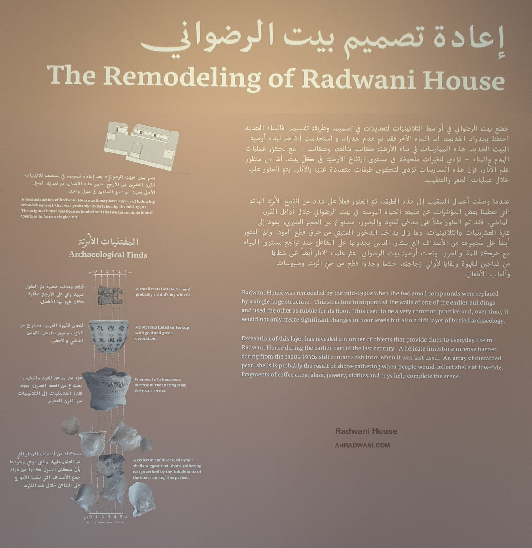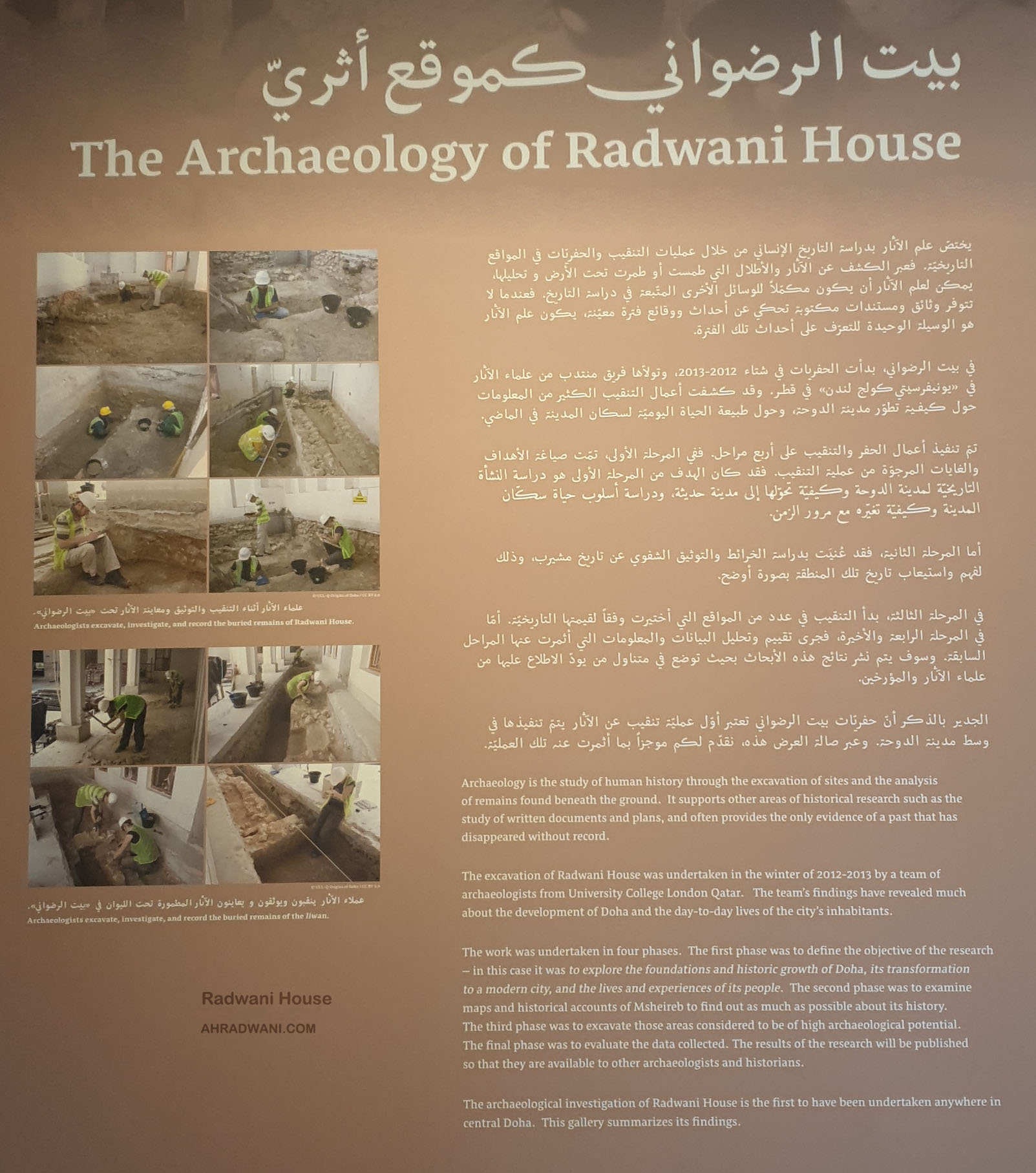 [89] About: The Msheireb Museums Department used this room to present information about the excavation, the work mechanism, and the archaeological findings in the Radwani House. قامت ادارة متاحف مشيرب باستخدام هذه الغرفه لعرض المعلومات عن التنقيب والية العمل والبموجودات الاثريه في منزل رضواني