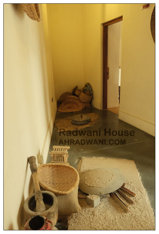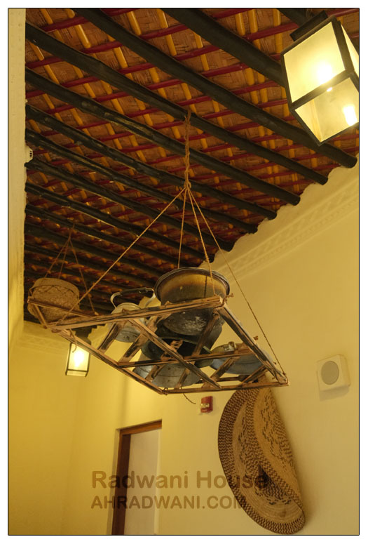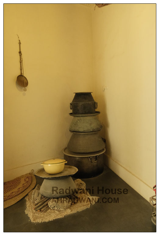 [41] About:The Kitchen: Different angle of the camera. ي هذه الصورة ، يمكننا أن نرى أن السقف كان مصنوعًا من جذع النخيل وسعف النخيل [كان جذع النخيل وسعف النخيل المواد الخام الرئيسية لبناء الأسقف في جميع المنازل في تلك الفترة الزمنية]. لتوفير بعض المساحة في المطبخ اعتادوا تعليق أشياء أخرى من السقف كما في الصورة.