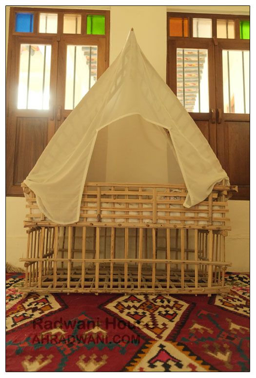 [72] About: A baby bed made of palm wood and covered with a piece of cloth to block insects and flies. سرير اطفال مصنوع من خشب النخيل ويغطى بقطعه من القماش لحجب الحشرات والذباب.