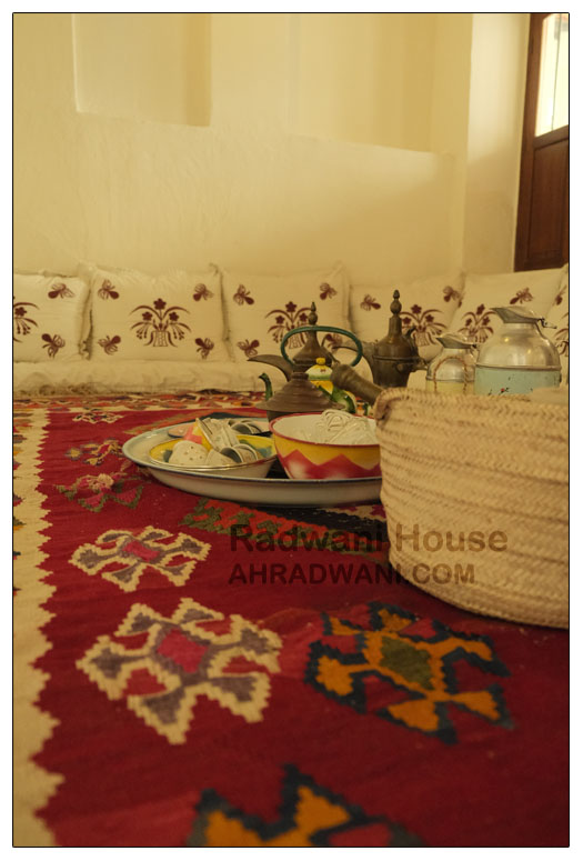 [66] About: Room-3[Living Room] Living Room is where the Family stay most of the time, the pillows embroidered with old, traditional designs are arranged around the wall, in the middle we can see the tea pot and a traditional stove. غرفة المعيشة هي المكان الذي تقيم فيه العائلة معظم الوقت ، والوسائد المطرزة بتصاميم قديمة وتقليدية مرتبة حول الحائط ، وفي المنتصف يمكننا رؤية إبريق الشاي والموقد التقليدي.