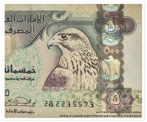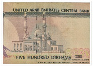 This is a shot of the 5000 UAE DIRHAMs [1$ = 3.67UAED], the both side of it contain an art,