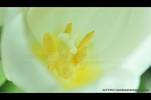 I use the Nikon Macro lens to shot the Stigma and the anthers of this white tulip, then I crop the image to get more close capture.