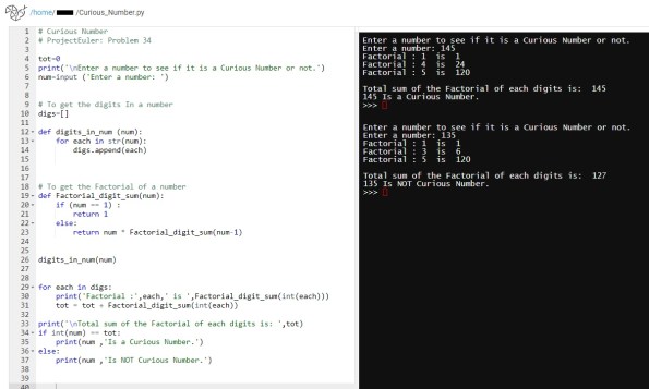 Our Task: We will write two functions, first one will get (return) all digits in the number, then another function to get the factorial of each digits in that number then with If statement we will examine the result.Enhancement: We will ask the user to enter a number and we will check if it is a Curious Number.