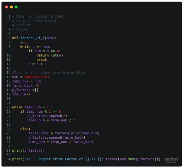 print(‘\n Largest Prime Factor of {} is {}’.format(num,max(p_factors)))