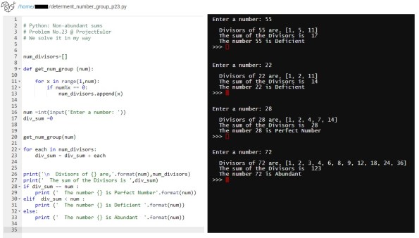 Enhancement: So instead of solving problem No.23, we will write a code to determent the group that a number belongs to. As we trying to make a general cods, we will ask the user to enter a number then we will call the function to collect all the divisors of N and get its sum and gives it a name according to the classification we just talk about.
